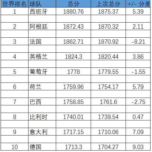 德国重返前十,而荷兰超过了巴西